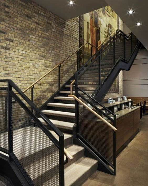 Стиль лофт в интерьере особенно гармонично смотрится при оформлении помещений с потолками высотой от 4-5 метров. Элементы ограждений, лестниц, например, можно плавно стилистически объединять с фактурой стен или предметов интерьера. Ограждение Лофт 4 – пример того, как цветовое решение перилл пересекается с цветом и фактурой кирпичной кладки. В данной модели перилла представлены в двух вариациях – привычные перилла в составе самого ограждения и дублирующие перилла в виде труб. С одной стороны лестницы, вдоль стены, перилла установлены на широко расставленных друг от друга стойках, с противоположной стороны перилла крепятся к ограждению. На представленном образце ограждения с внешней стороны элементы как прямоугольной формы, так и в форме параллелепипеда. Внутри элементов сетка. Тем самым соблюдается одна из самых важных характеристик стиля лофт – открытость и прозрачность.
