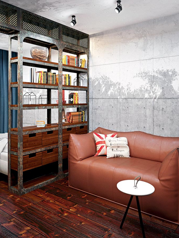 Стеллаж-перегородка в стиле лофт состоит из стального каркаса с множеством полок, а также ниш разного размера и формы. Он может быть любого размера и высоты, хоть до потолка. Классическое сочетание черного металла и светлого дерева смотрятся стильно.